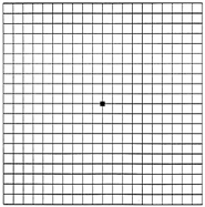 3. •Amsler grid. Your eye care professional also may ask you to look at an Amsler grid. Changes in your central vision may cause the lines in the grid to disappear or appear wavy, a sign of AMD.